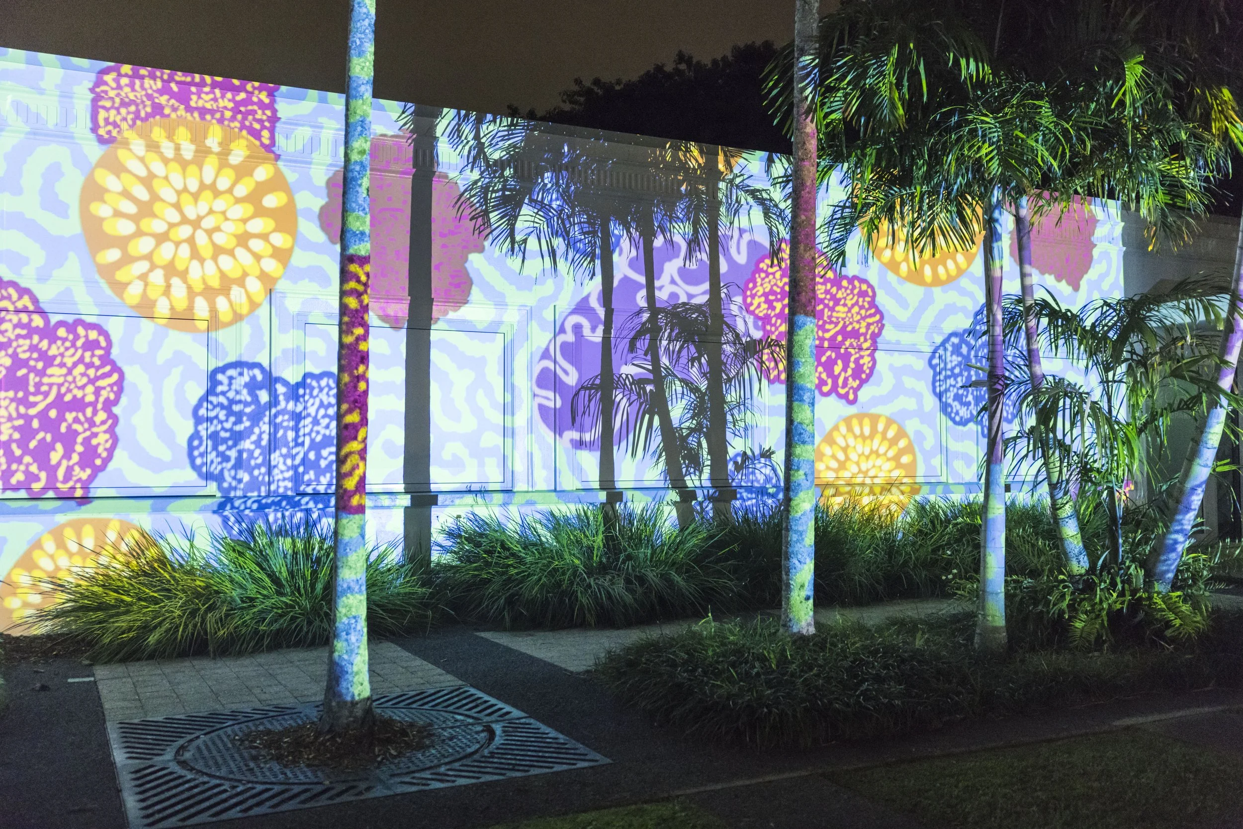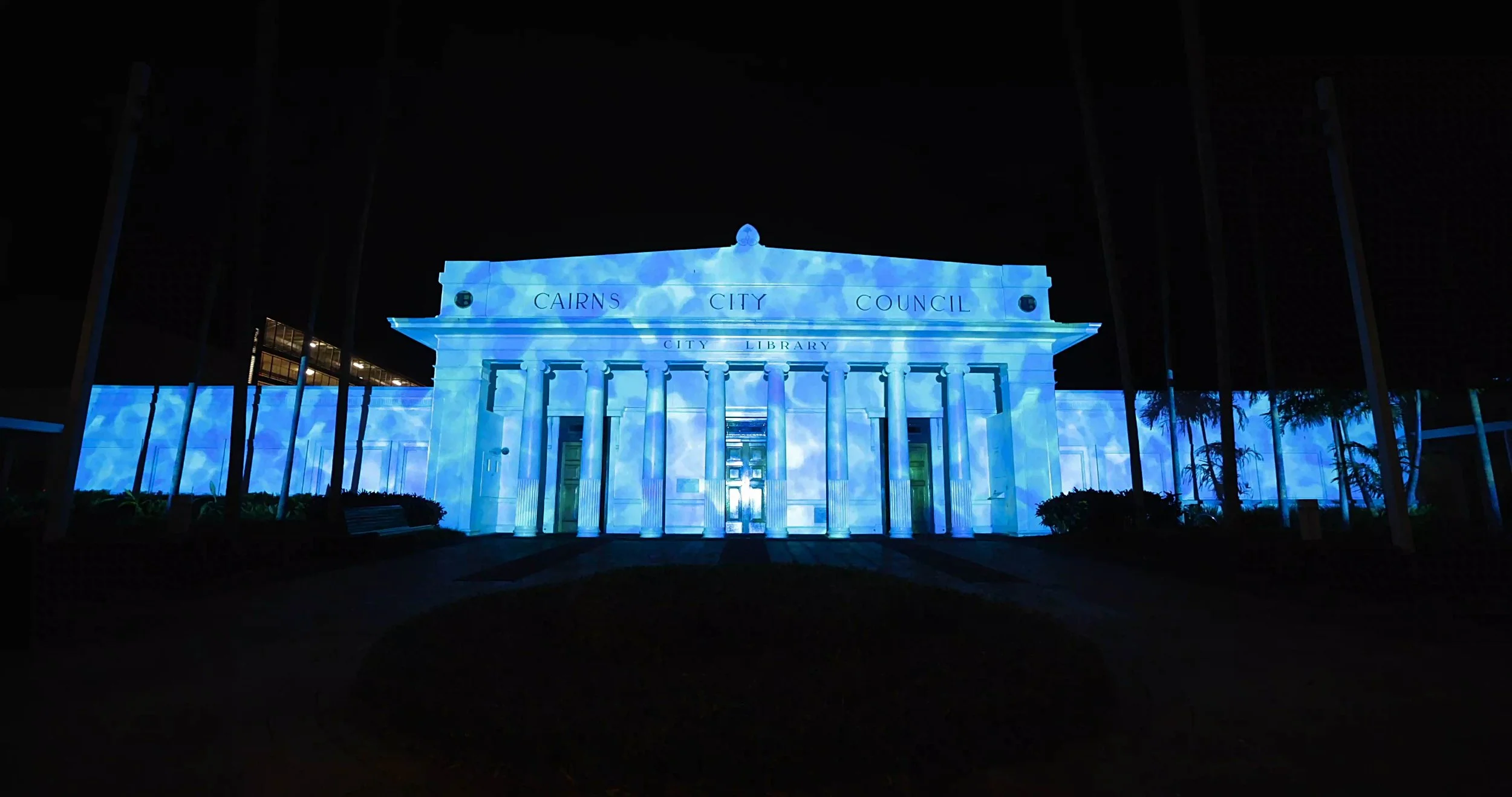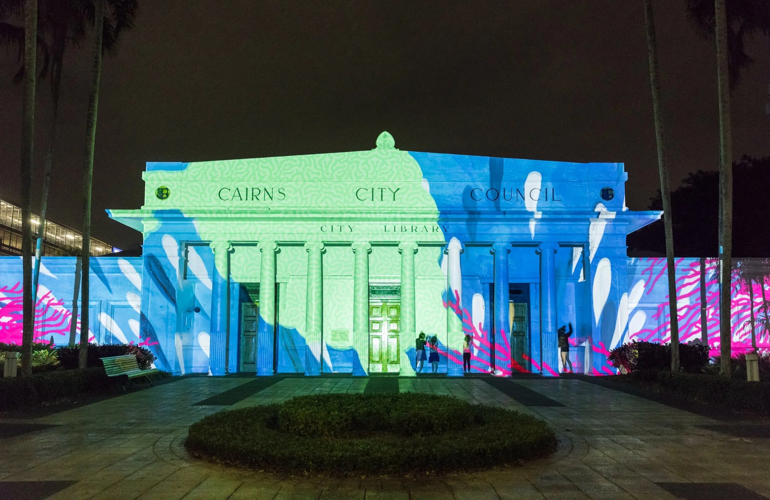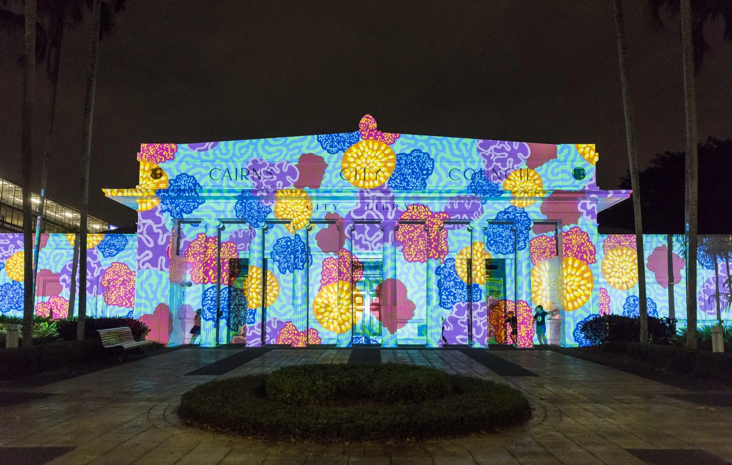 We collaborated with Agb Events to create a large scale projection on Cairns City Library with local renowned textile designer and artist Francoise Lane. Her gorgeous and compelling artworks are inspired by her connection to the Torres Strait Islands and her exploration of visual storytelling.